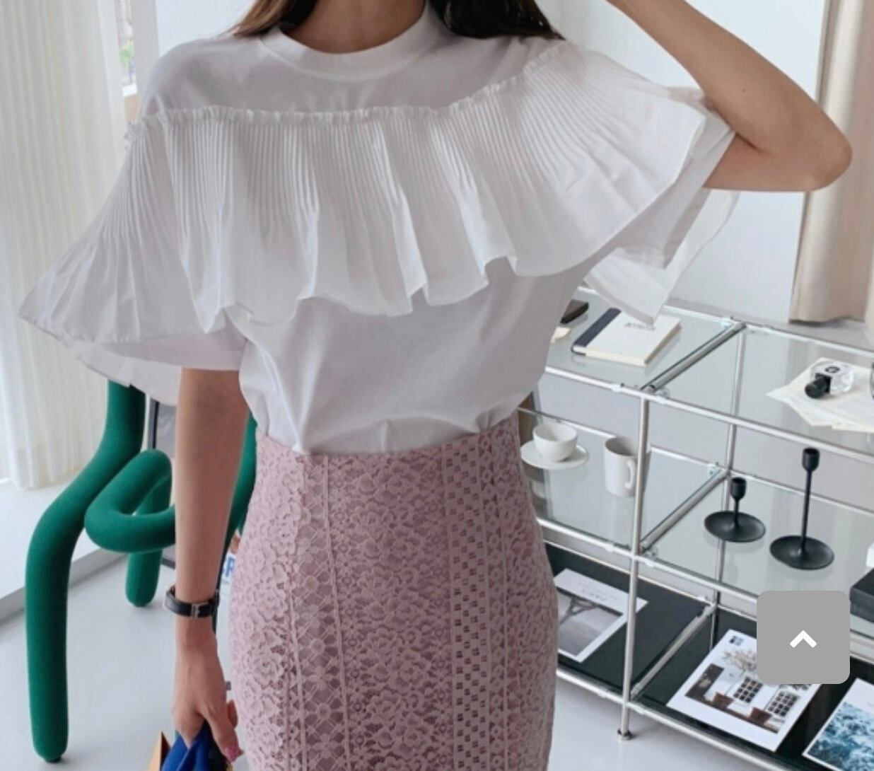 胸元に大胆なフリルがついたデザインカットソー。
